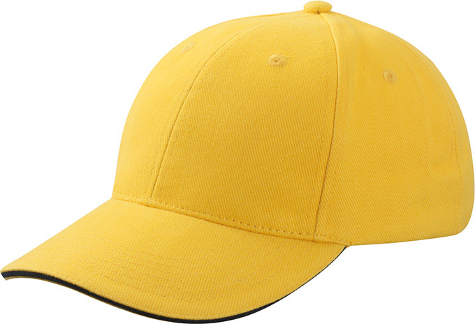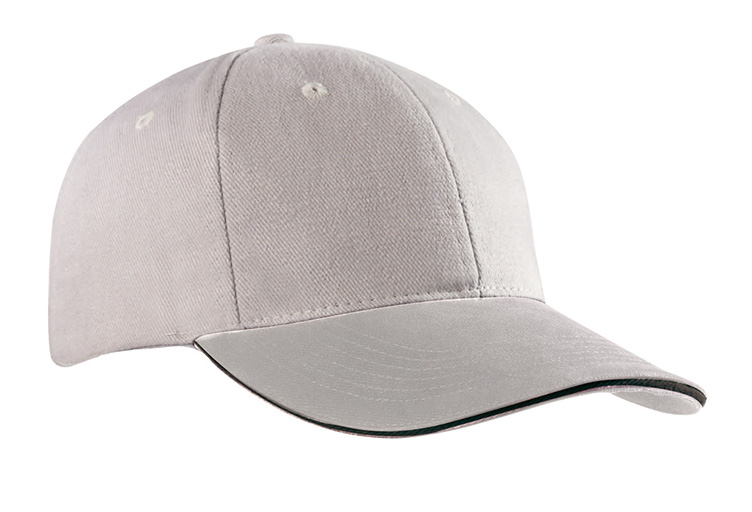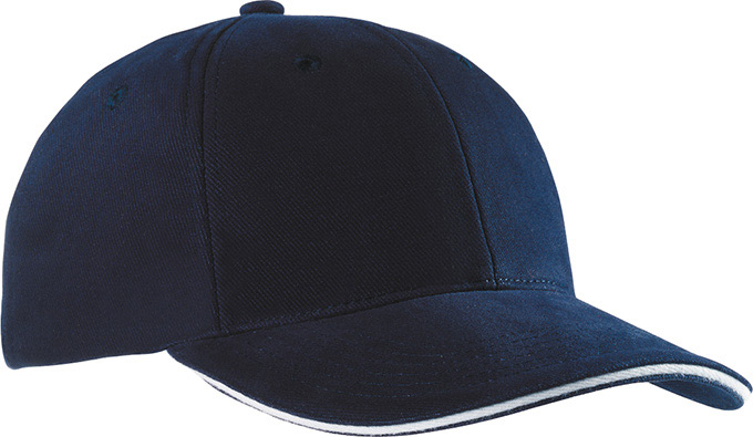 Sandwich-Cap mit konstrastfarbigem Sandwich, 6 gestickte Luftlöcher, 6 Ziernähte am Schild, mit Metallclipverschluss in Messing verstellbar.