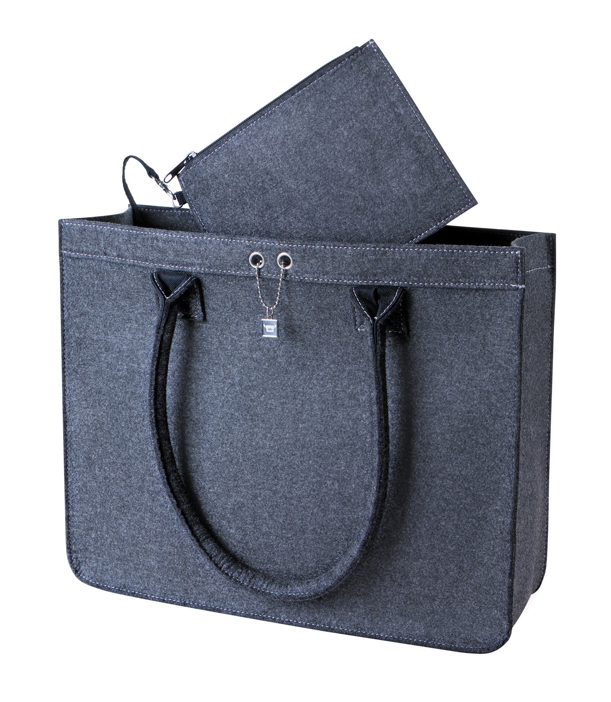 Hochwertige Filztasche, innen abnehmbare, flache Wertsachen-Reißverschlußtasche, Hauptfach mit verstärtem Boden, Handgriffe und Schultergurt.