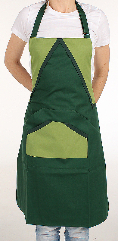 Latzschürze, zwei Mitteltaschen mit seitlichen Eingriffen, Nackenband mit Schieße verstellbar.