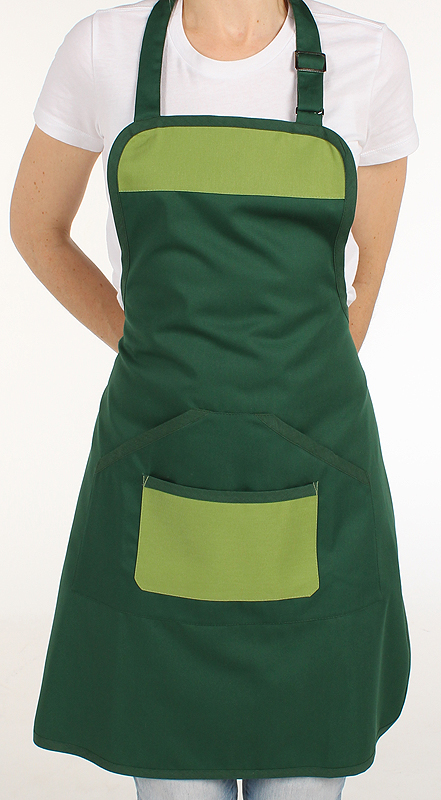 Latzschürze, kleinere Form, zwei Mitteltaschen, ideal kombinierbar mit JO, Nackenband mit Schließe verstellbar.