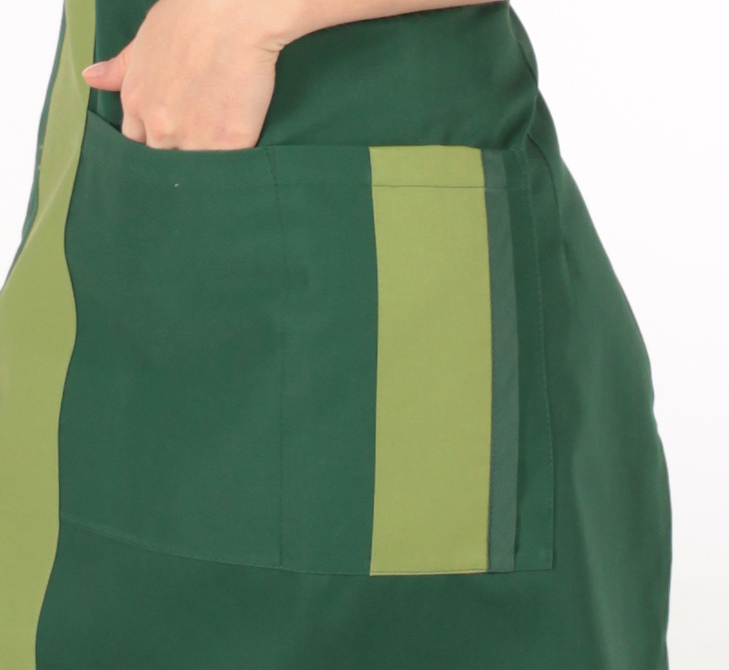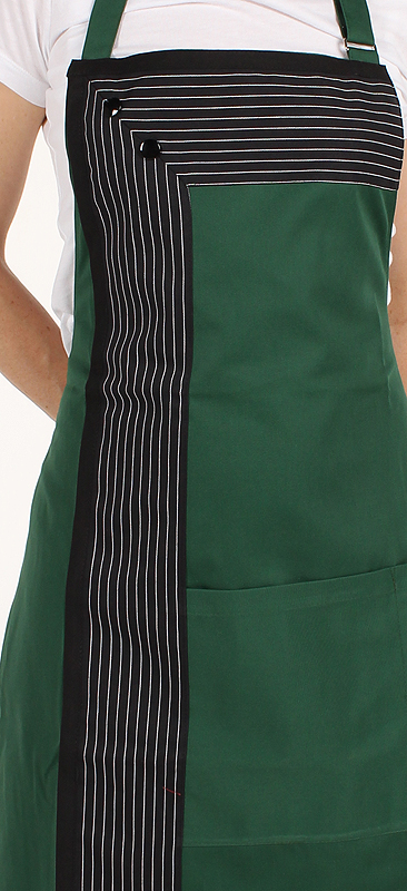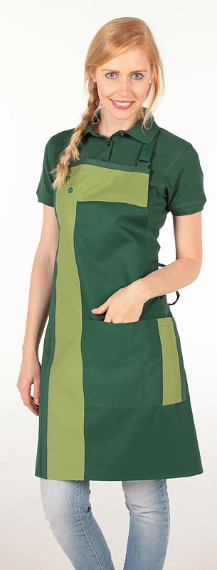 Latzschürze mit einer Mitteltasche, Nackenband mit Schließe verstellbar.