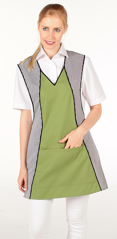 Latzschürze mit einer Mitteltasche, Nackenband mit Klettverschluß verstellbar.