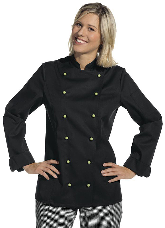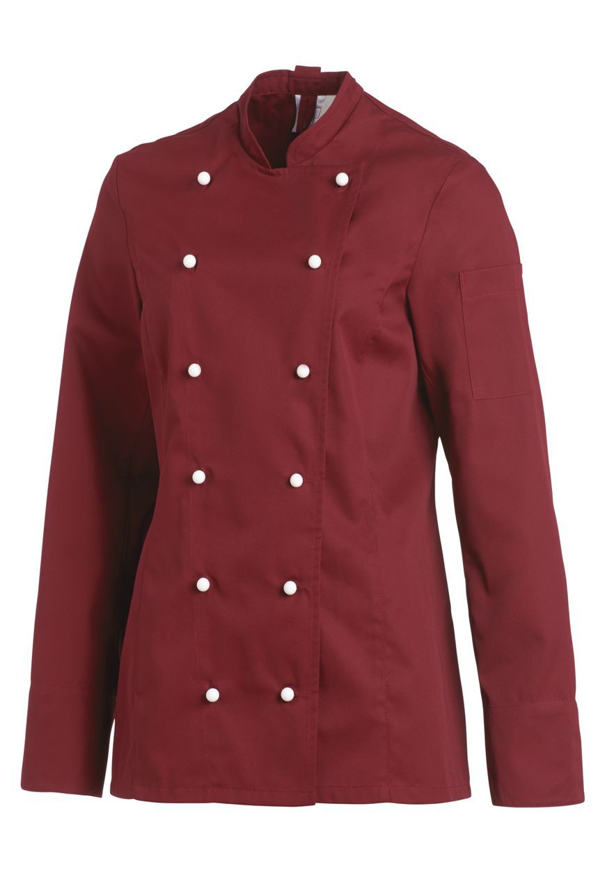Kochjacke für Damen mit Langarm, leicht tailliert, Teillungnähte, 6-Loch-Knopfreihe, eine Ärmeltasche. Kugelknöpfe bitte separat bestellen.