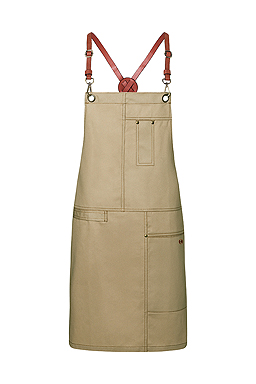 Modern-lässige Latzschürze in Twill-Optik mit Kreuzträgern zur Entlastung des Nackens, einfaches Abnehmen und Befestigen aller Bänder mit Hilfe von Karabinerverschlüssen, Schnallen zum stufenlosen Einstellen der Länge, zusätzliches Taillenband zum Regulieren der Weite garantiert einen festen Sitz, bronzierte Nieten und kontrastfarbige Steppnähte sorgen für einen unverwechselbaren Urban-Style, funktionale Bänder aus Echtleder, praktische Stoffschlaufe auf der rechten Seite zum Befestigen eines Kassierhalfters oder Geschirrtuchs, linksseitige Tasche, und Stiftfach auf Brusthöhe.