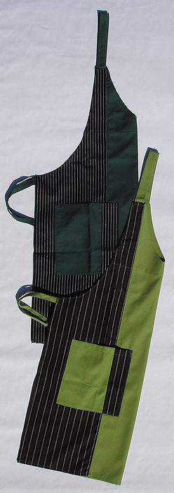 Latzschürze, eine Tasche rechts, Nackenband mit Druckknopf verstellbar.