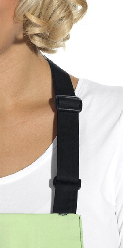 Latzschürze mit einer Tasche rechts, Kontraststeppung, Nackenband mit Schließe verstellbar.
