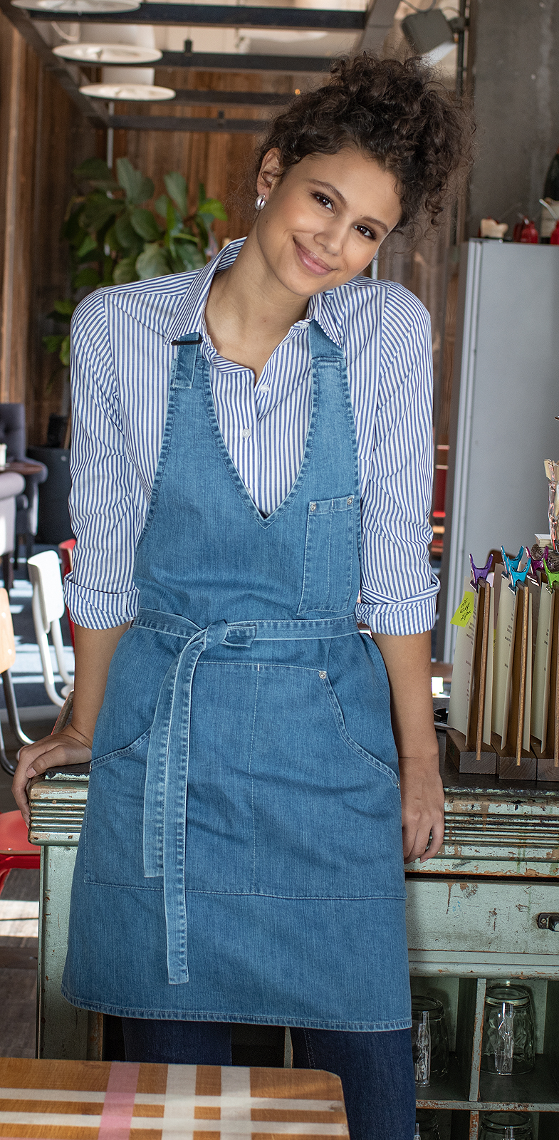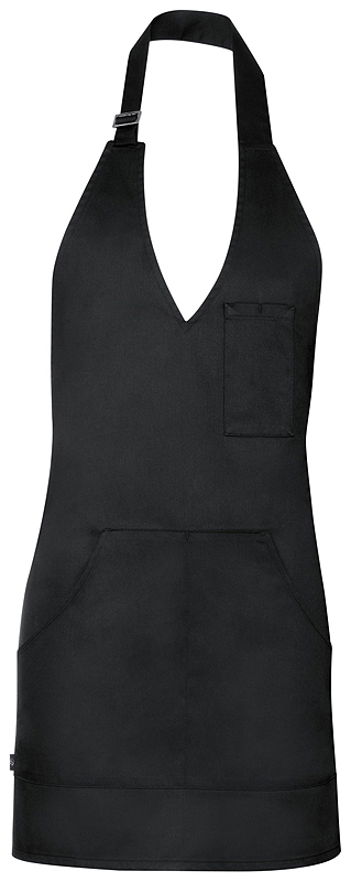 Latzschürze mit einer Brusttasche, zwei aufgesetzte Taschen, Nackenband mit Schließe verstellbar.