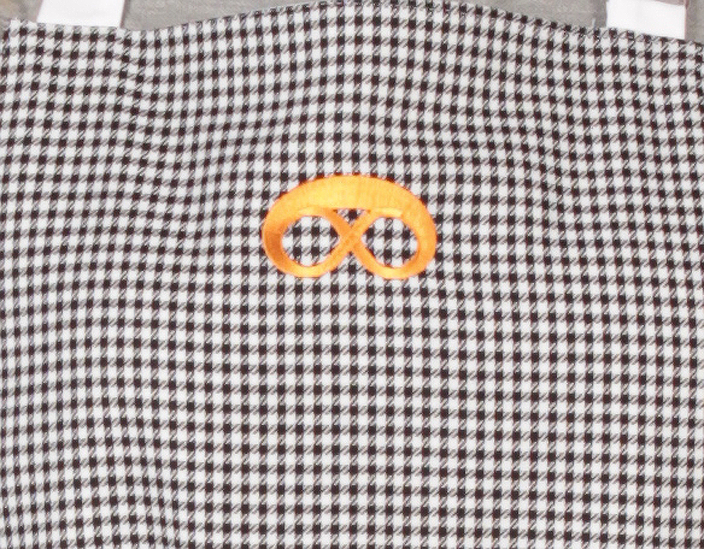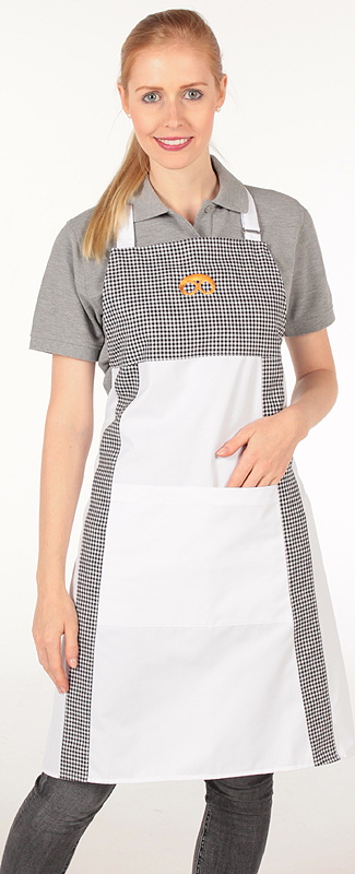 Latzschürze mit Einstickung "Brezel", eine Mitteltasche, Nackenband mit Schieße verstellbar.