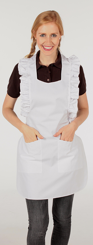 Kleine Latzschürze mit Rüsche am Latz, Nackenband mit Klettverschluß verstellbar.
