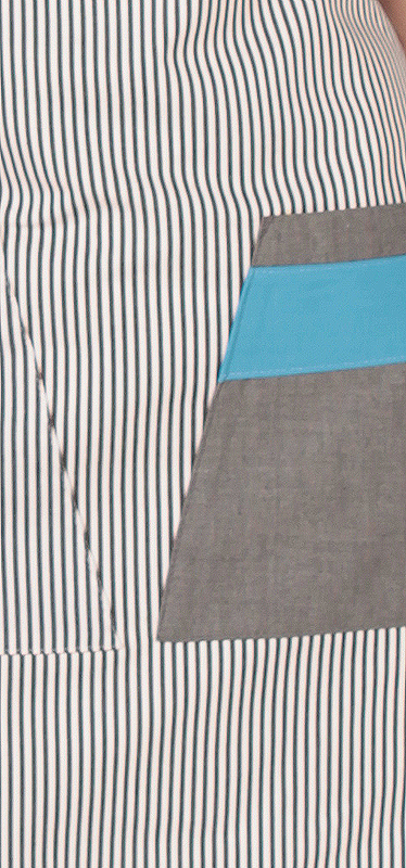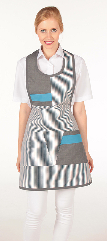 Latzschürze mit zwei Taschen, Nackenband mit Klettverschluß verstellbar.