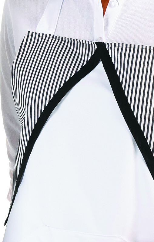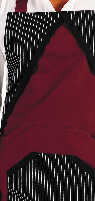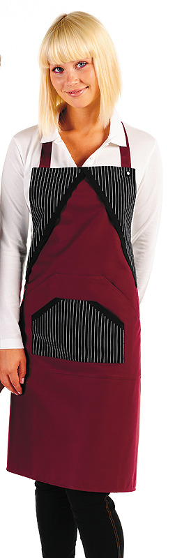 Latzschürze, zwei Mitteltaschen mit seitlichen Eingriffen, Nackenband mit Schieße verstellbar.