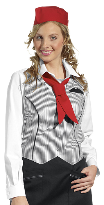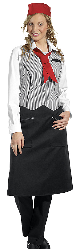 Wickelrock, Rockteil hinten komplett geschlossen, mit Druckknöpfen verstellbar, Einstecktuchblende auf Westenteil, zwei Taschen.
