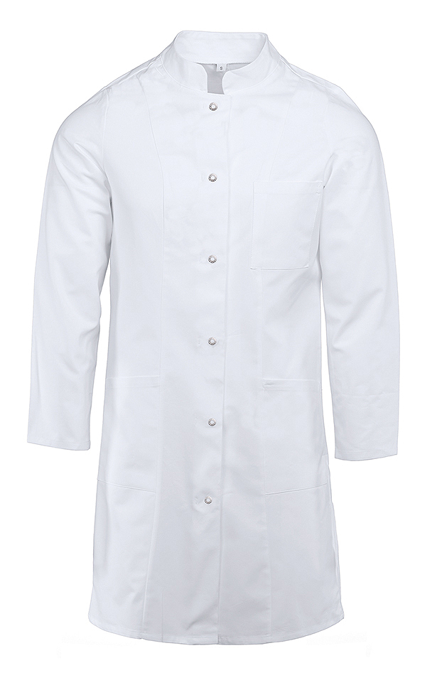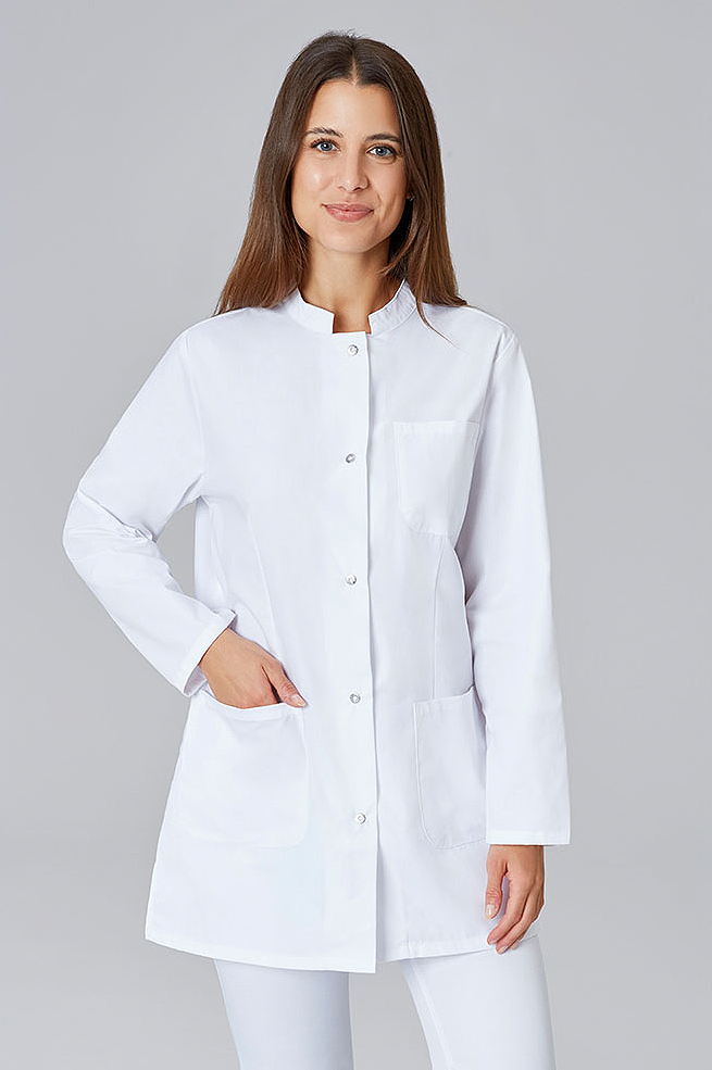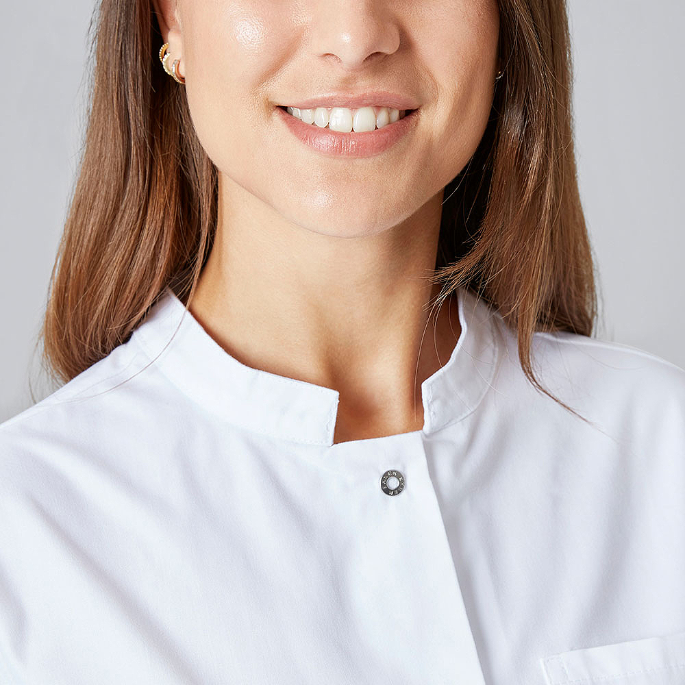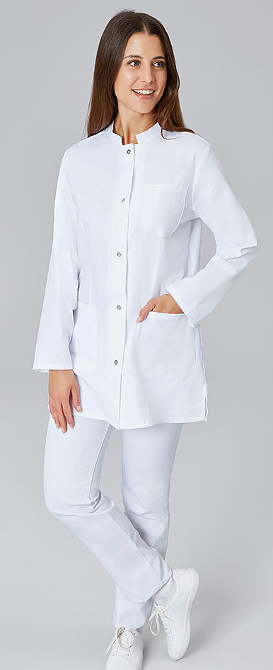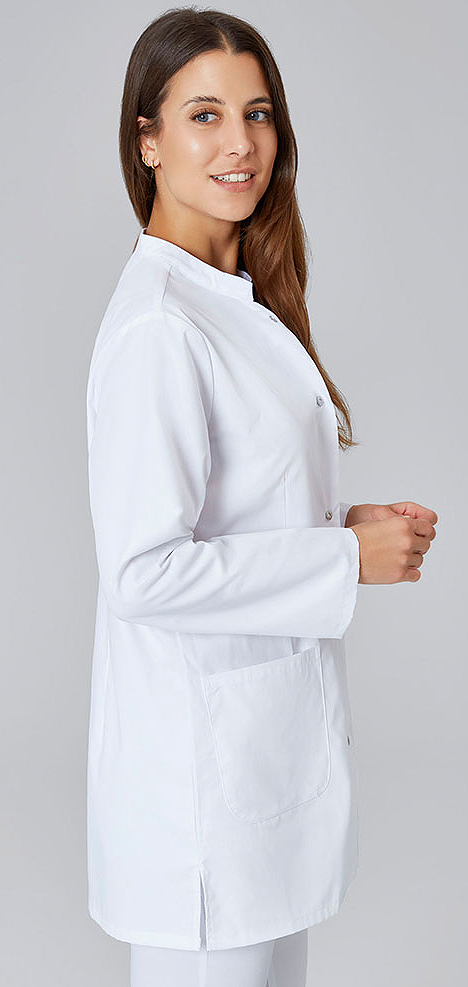 Kurzmantel für Damen mit Stehkragen Langarm, dekorative Druckknopfleiste, eine Brusttasche, zwei aufgesetzte Seitentaschen, Seitenschlitz 10 cm.