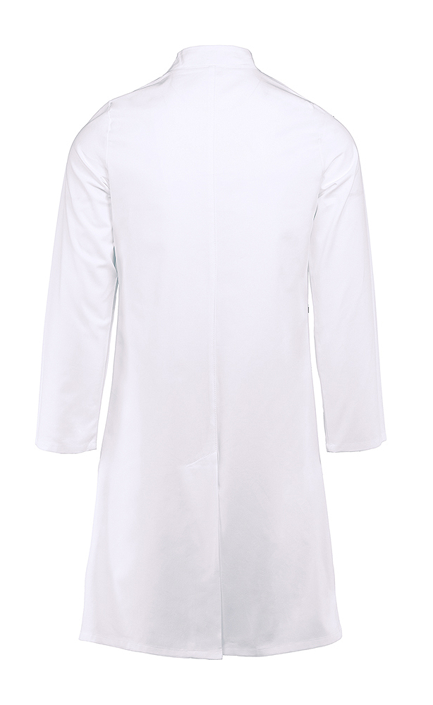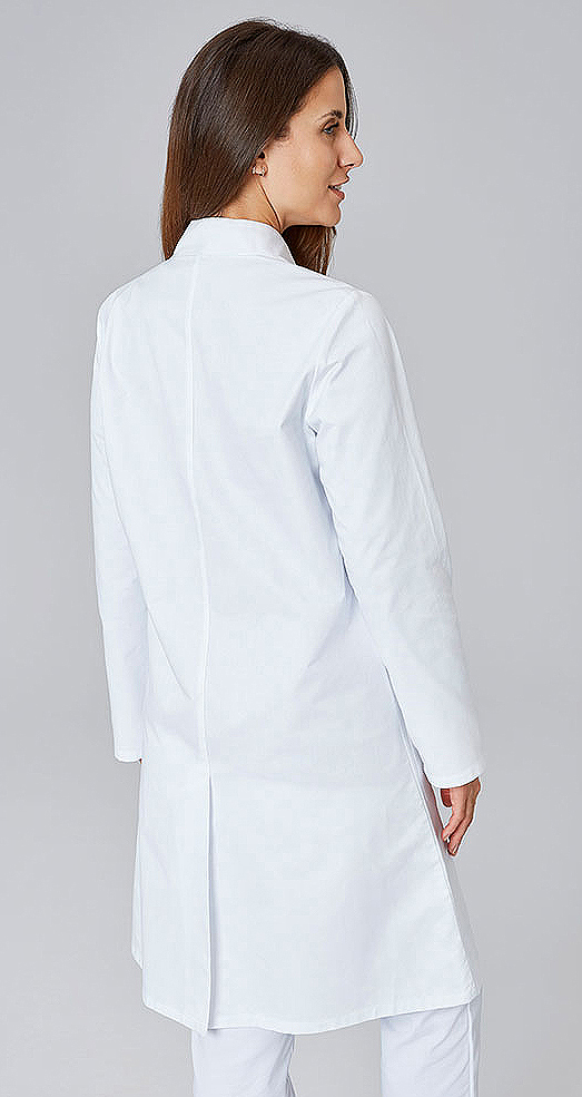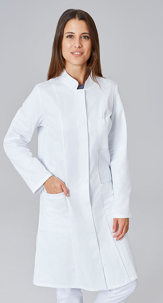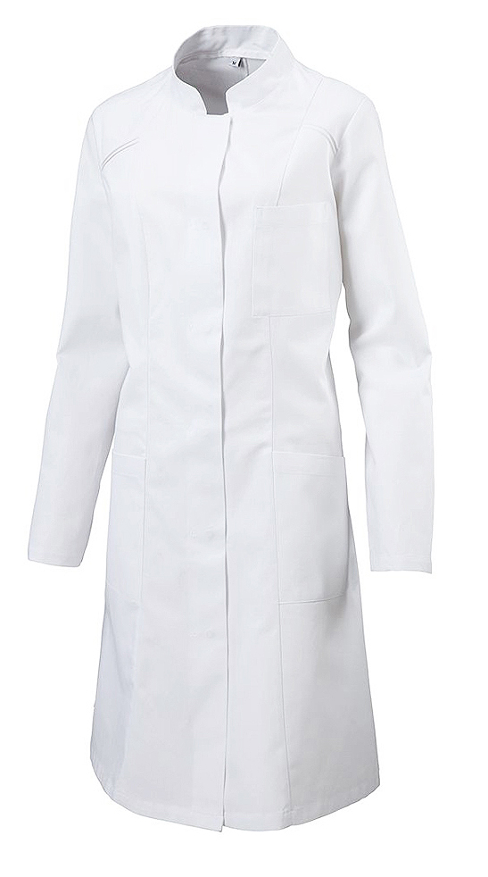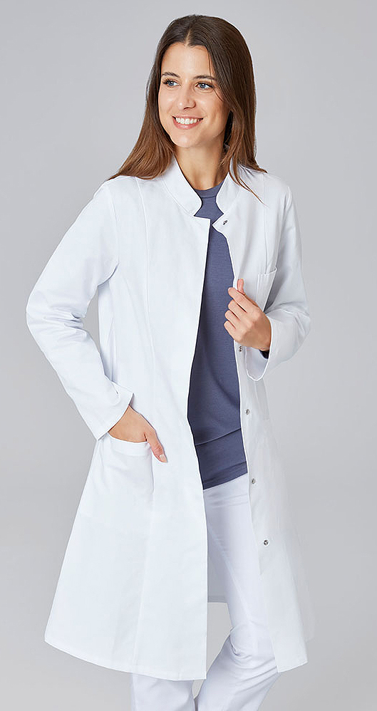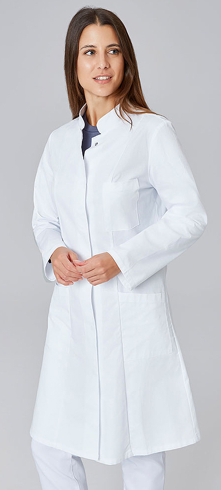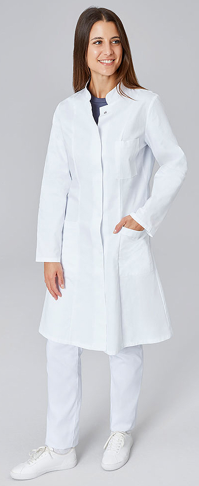 Damenmantel, mit Stehkragen, eine Brusttasche (ca. 12 cm x 13 cm, Breite x Höhe), zwei Seitentaschen, mit Druckknöpfen, Gehschlitz, zwei Materialoptionen verfügbar (Baumwolle oder Mischgewebe).