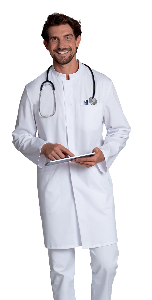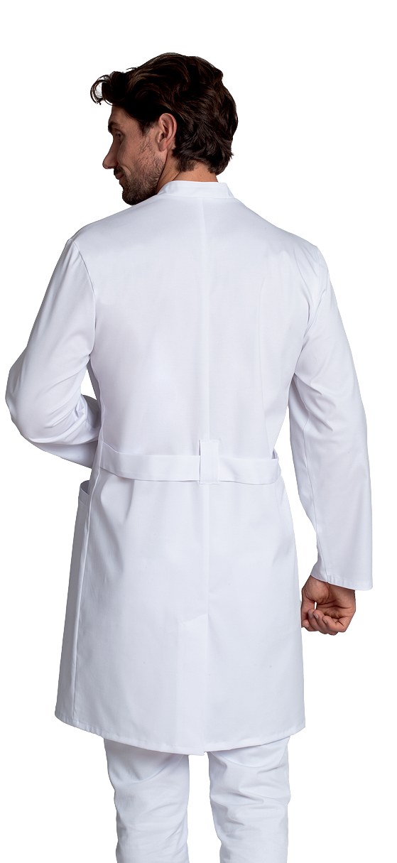 Herrenmantel, Langarm mit verdeckter Druckknopfleiste, eine Brusttasche, zwei elegante eingelassene Seitentaschen, komfortabler Gehschlitz, Stehkragen, Rückenriegel, formstabiles und elastisches TENCEL Gewebe, passend zu Damenmodell Loca.
