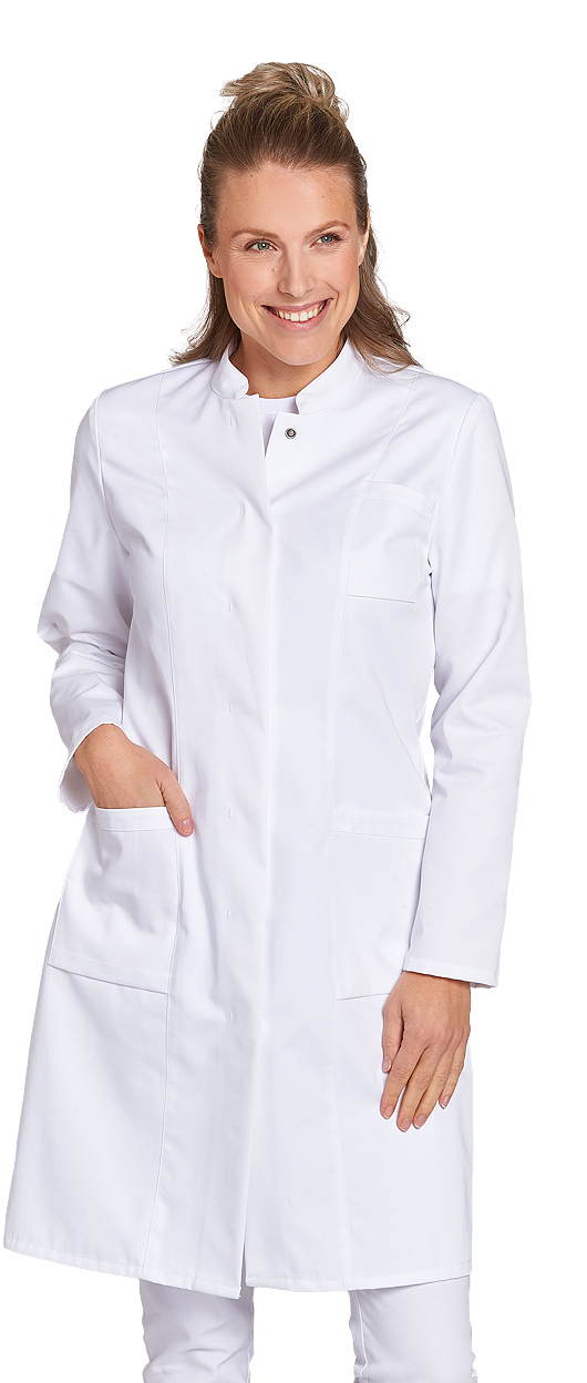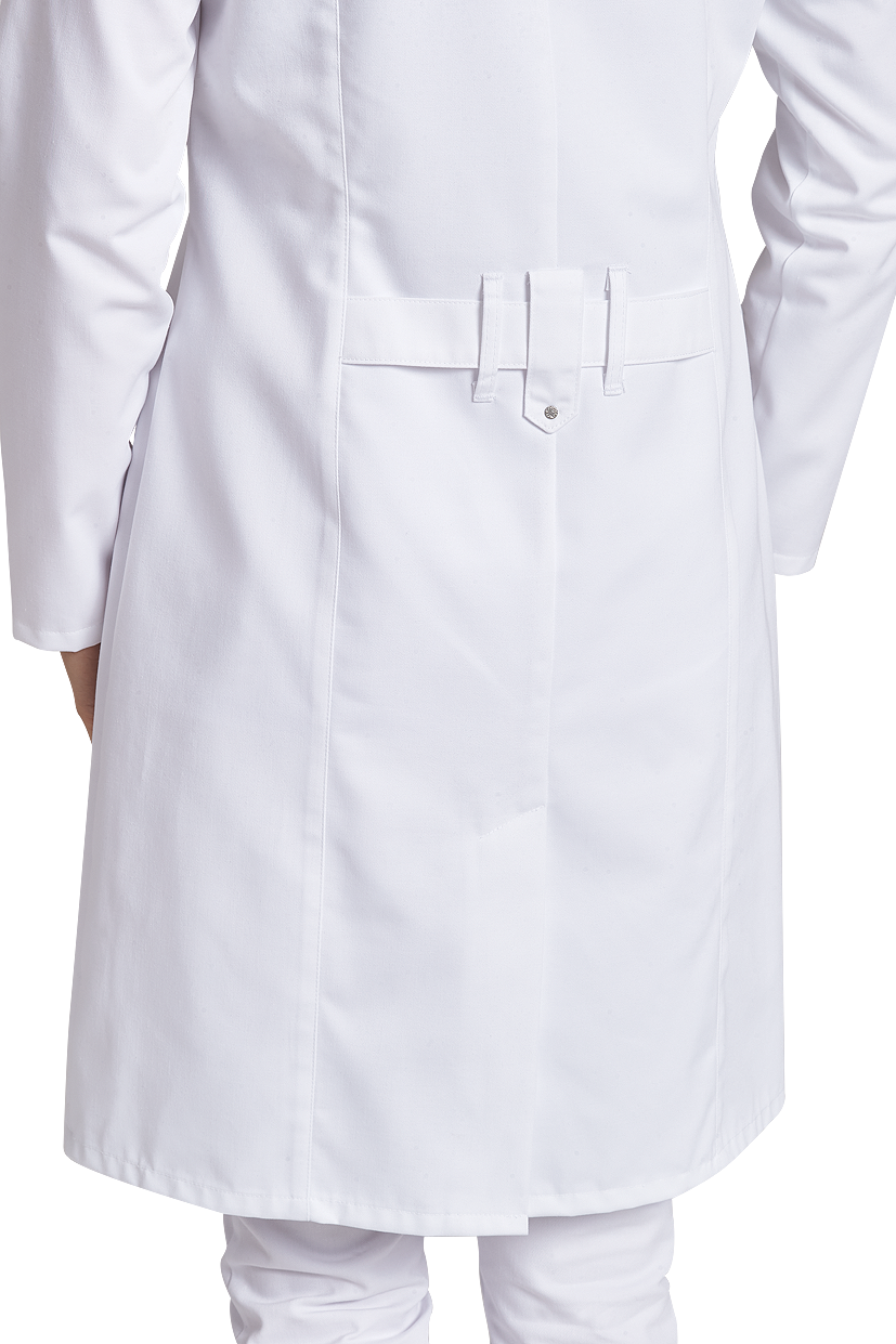 Damenmantel, Langarm mit verdeckter Druckknopfleiste, sehr weiches Cooltex-Gewebe, eine Brusttasche, zwei Seitentaschen, eine Piepertasche, Stehkragen, Rückengurt, Gehschlitz, passend zu Herrenmodell Lorenzo.