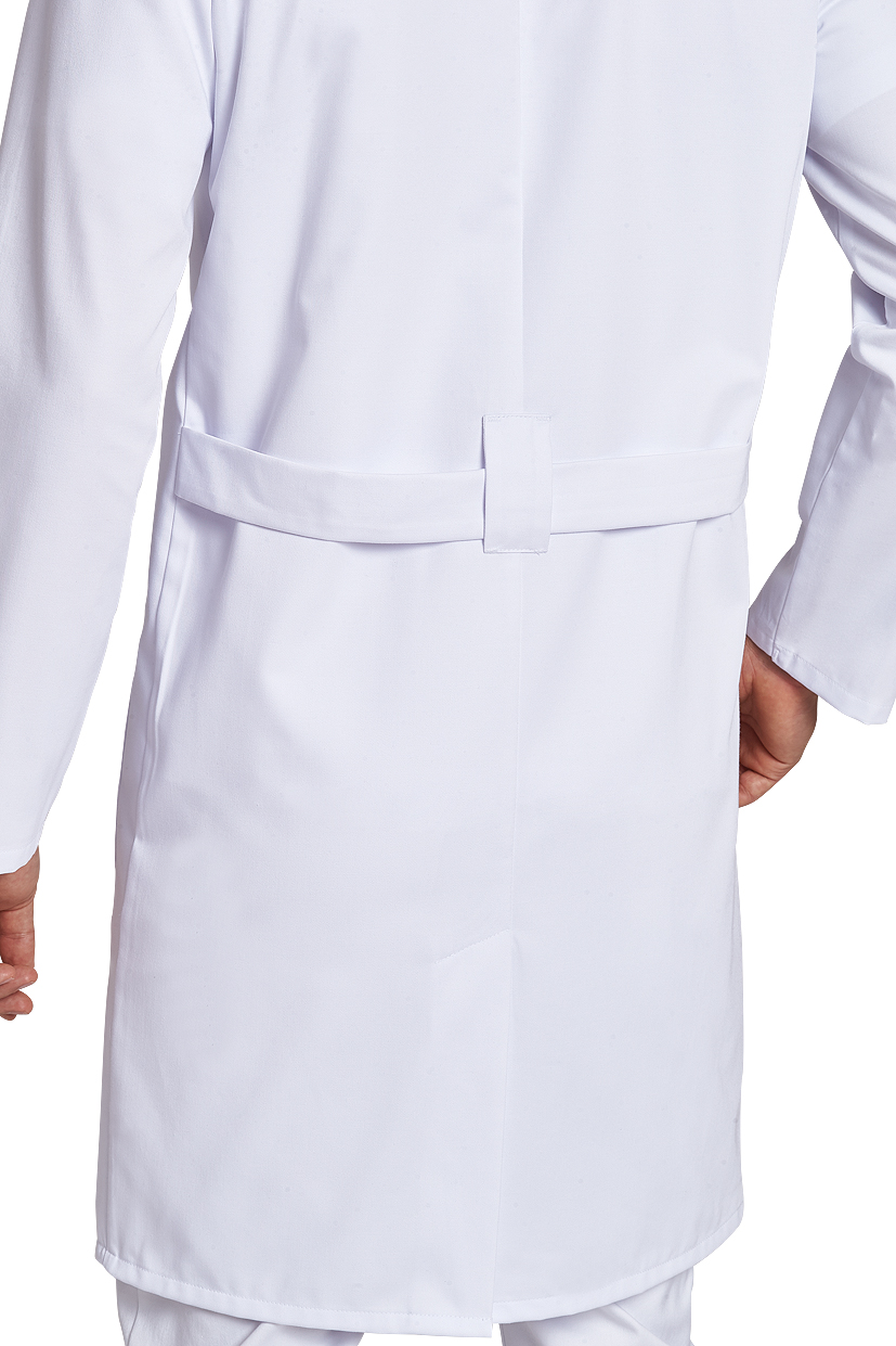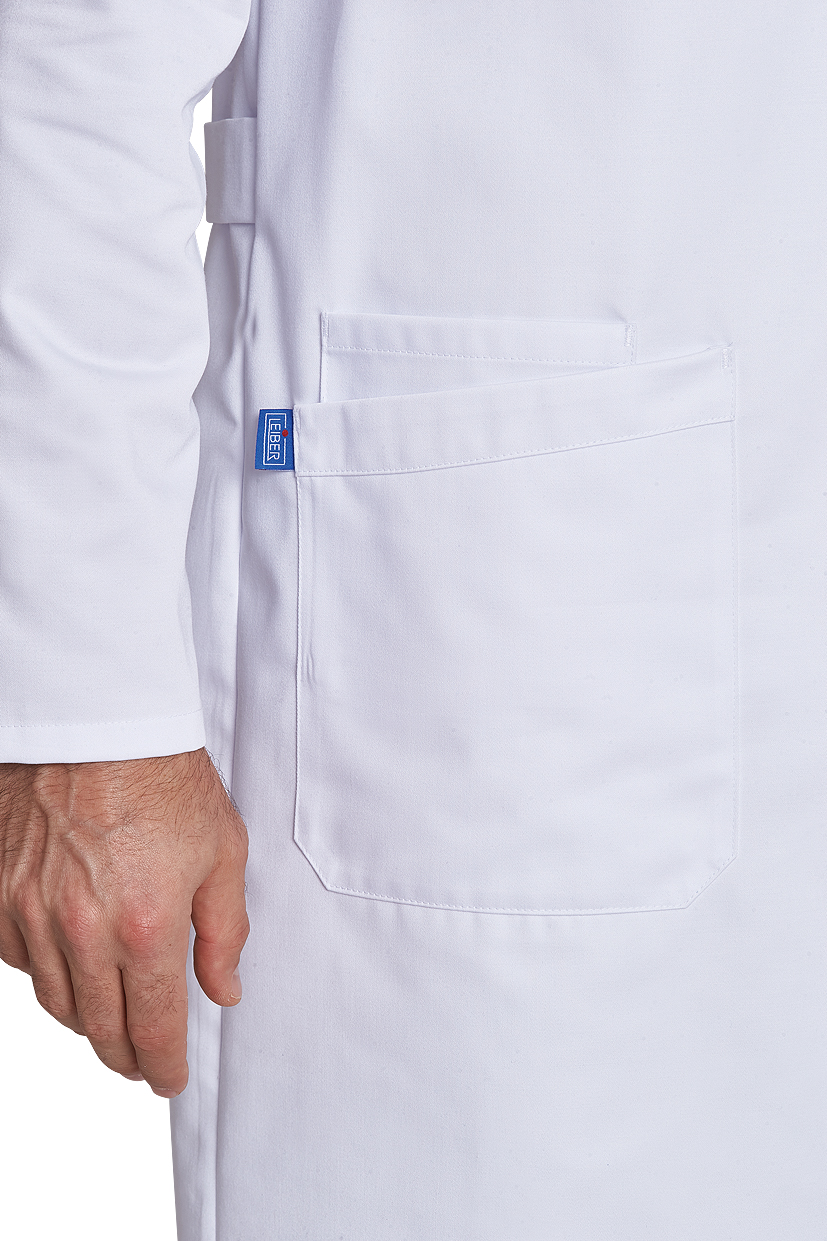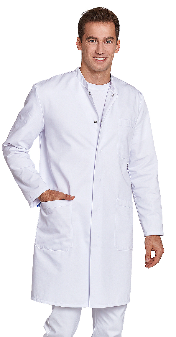 Herrenmantel, Langarm mit verdeckter Druckknopfleiste, sehr weiches Cooltex-Gewebe, eine Brusttasche, zwei Seitentaschen, eine Piepertasche, Gehschlitz, Stehkragen, Rückenriegel, passend zu Damenmodell Luzifer.