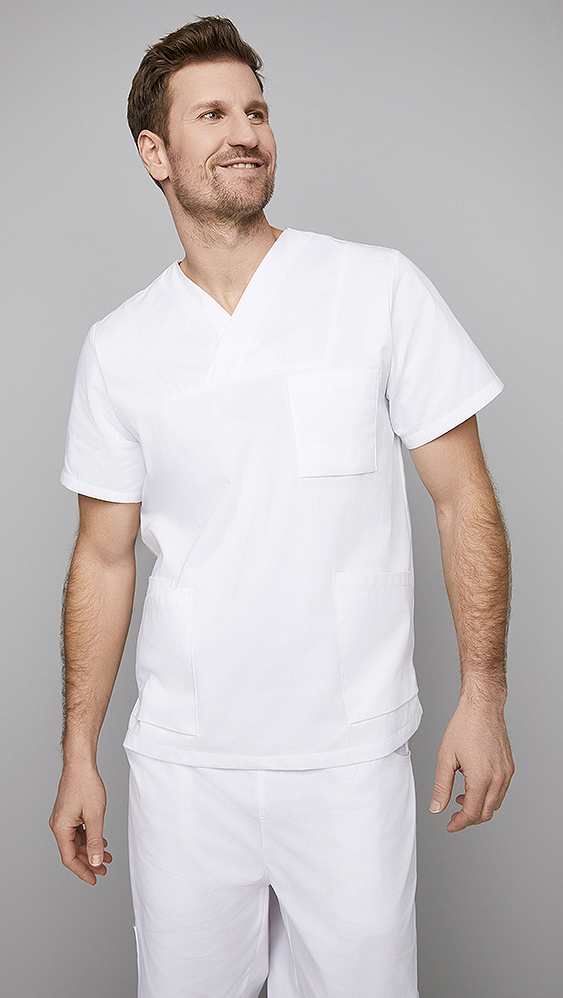 Unisex Schlupfkasack mit hoch geschnittenem V-Ausschnitt, eine Brusttasche, zwei aufgesetzte Seitentaschen, Seitenschlitze.