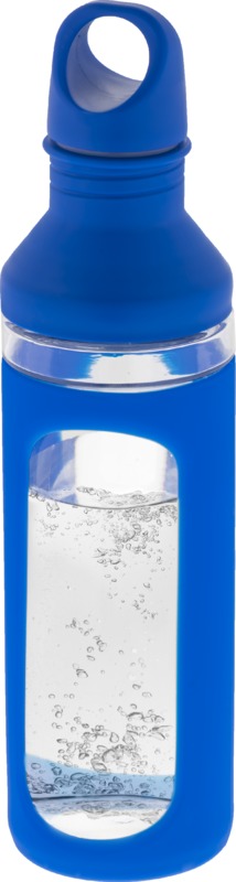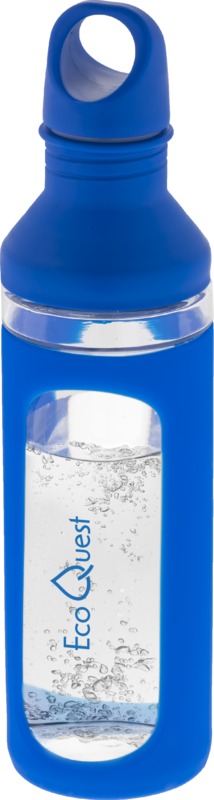 Einwandige, transparente Glasflasche, ummantelt mit schützender Silikonhülle, Schraubverschluss mit Karabiner Haken, leine Öffnung oben, durch die zweite Öffnung kann man Eiswürfel hinzuzufügen, leicht zu reinigen, nicht für warme Getränke geeignet, BPA frei. Volumen 590 ml,packung, Logo möglich.
