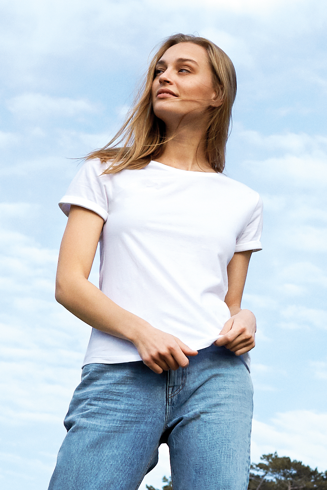 Roll up Damen T-Shirt, fairtrade zertifizierte, gekämmte Bio-Baumwolle, Single Jersey Strick, moderne Paßform, Rundhalsausschnitt, Nackensaum innen, Hochkrempel-Detail am Ärmel, Oeko-Tex 100 Standard.