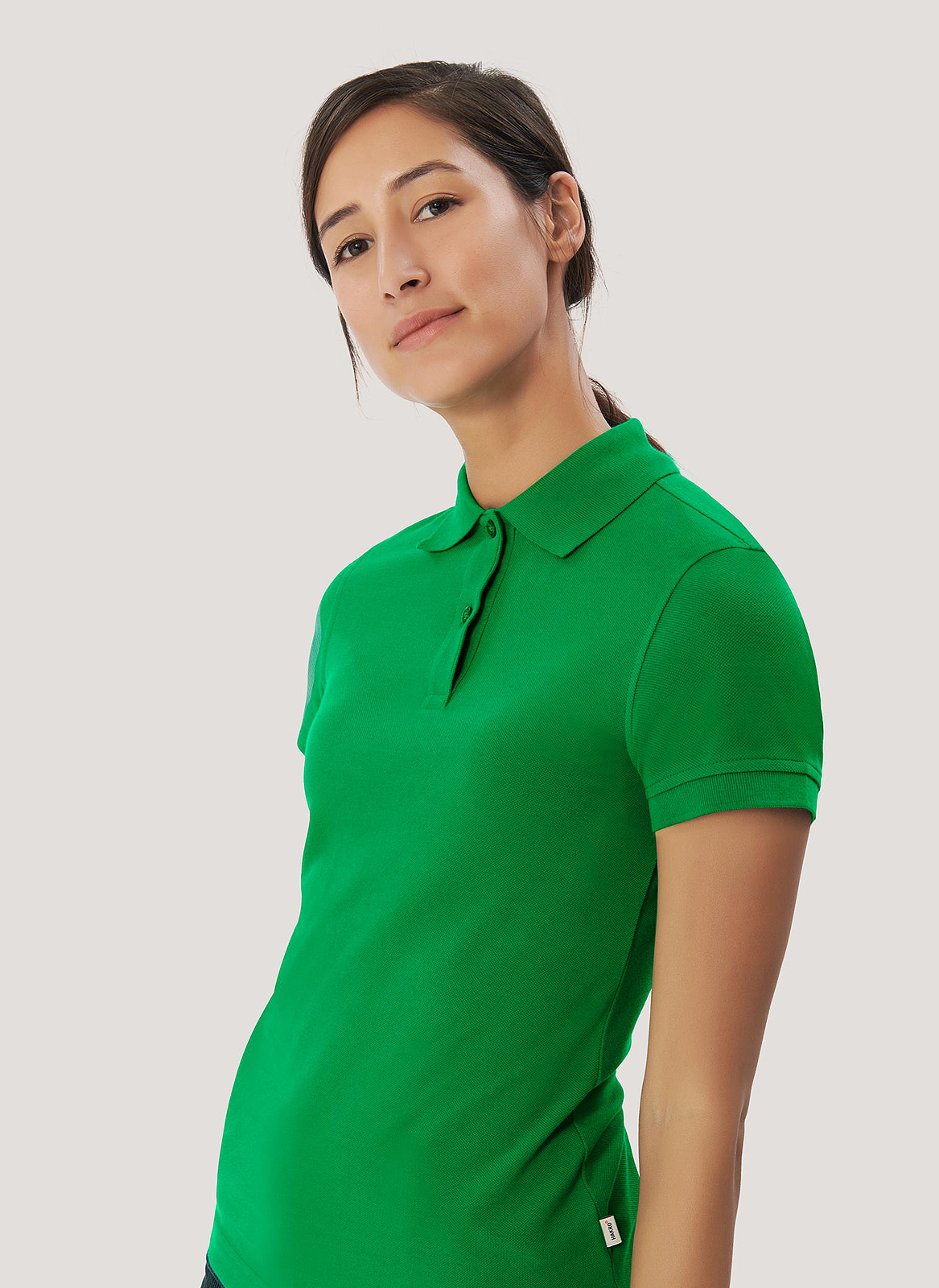 Hochwertiges, feinmaschiges Piqué-Poloshirt für Damen mit körpernahem Schnitt. Verkürzte 2-Loch-Knopfleiste mit extra haltbar vernähten, bruchsicheren Knöpfen "Ton-in-Ton".