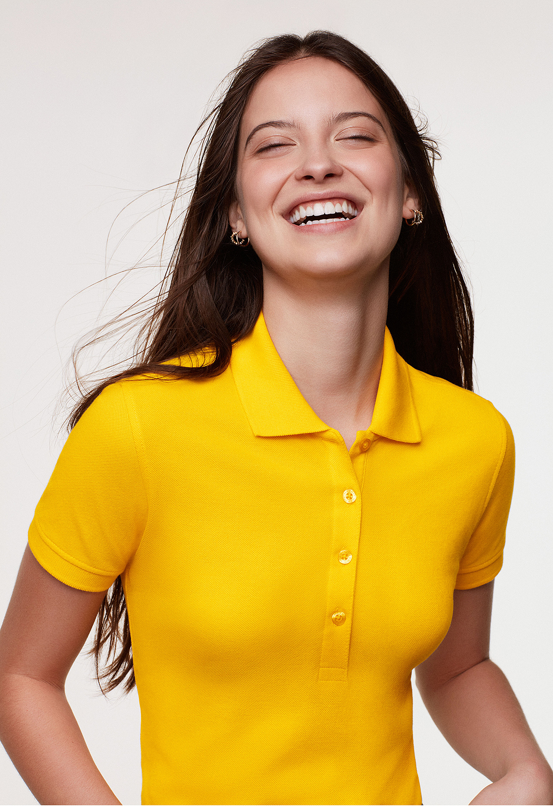 Klassisches, feinmaschiges Piqué-Poloshirt für Damen, modisch verlängerte 4-Loch-Knopfleiste mit extra haltbar vernähten, bruchsicheren Knöpfen "Ton-in Ton", doppelt geriegelte Seitenschlitze.