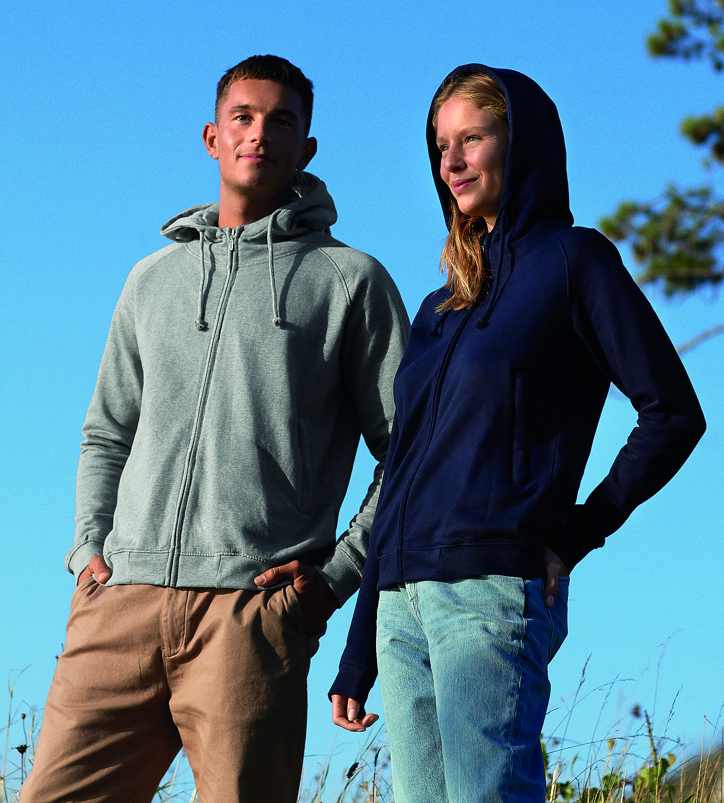 Unisex Sweatjacke mit Kapuze aus fairtrade-zertifizierter, gekämmter Bio-Baumwolle, Vlies mit gebürsteter Rückseite, Kängurutaschen, passender und verborgener YKK-Reißverschluß, doppelt gefütterte Kapuze, Elasthan Ripp an Ärmeln und Unterseite.