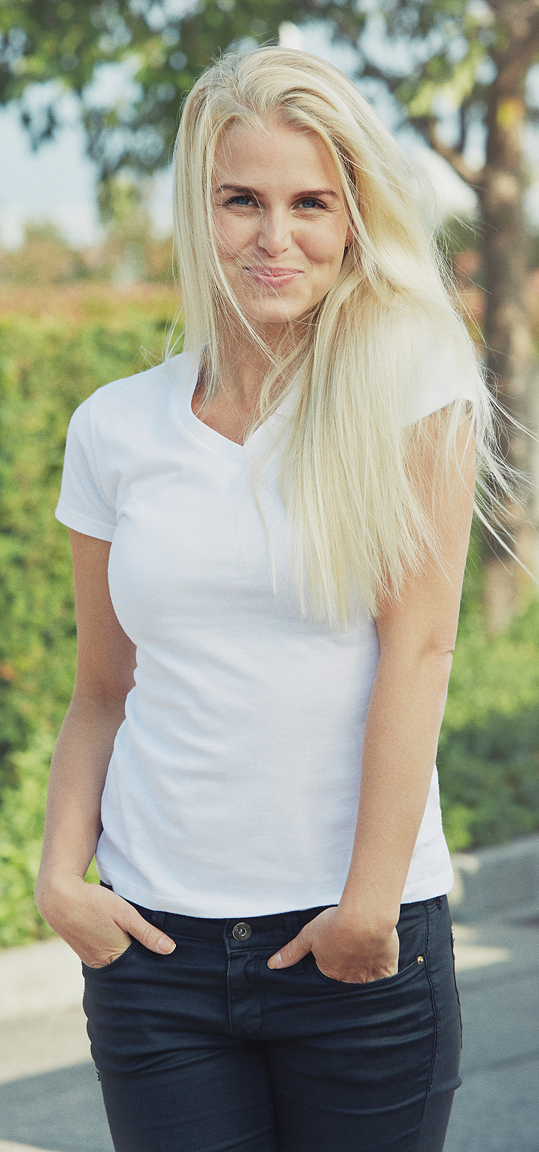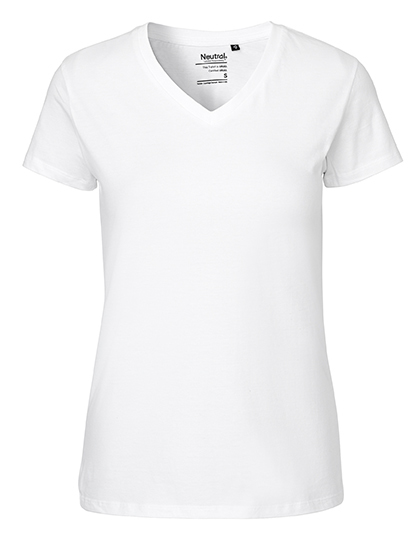 Damen-T-Shirt mit V-Ausschnitt aus Bio-Baumwolle, fairtrade-zertifiziert, Single-Jersey-Strick, Nackensaum innen, Oeko-Tex.