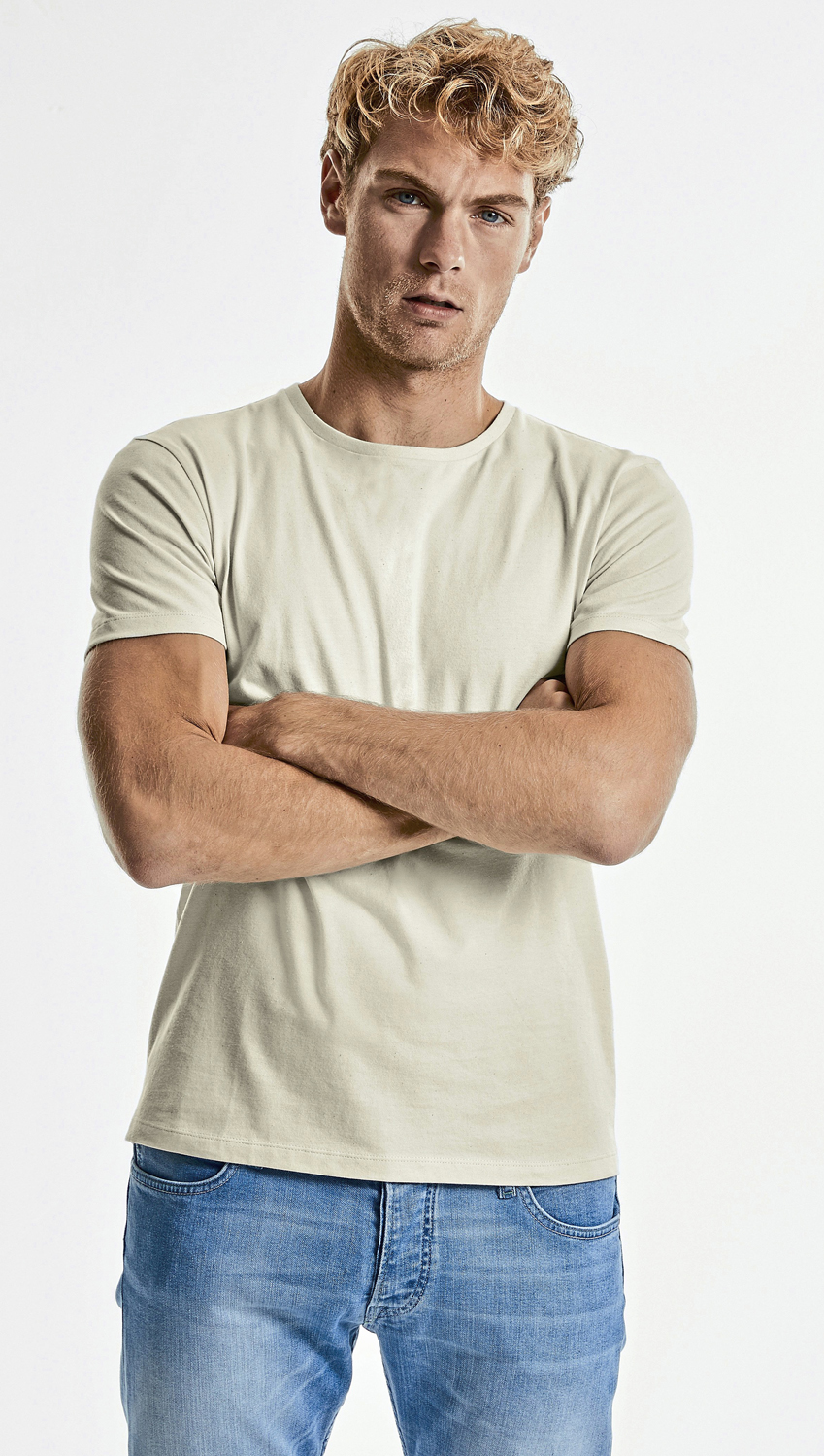 T-Shirt aus gekämmter, ringgesponnener Bio-Baumwolle, Single-Jersey, speziell gefertigtes Schulter-zu.Schulter Nackenband für mehr Stabilität und edlem Erscheinungsbild, label-free, Größenetikett im Nacken, schmales Kragenbündchen aus Lycra®, Seitennähte für optimale Paßform, angehmer und kühler Warengriff.