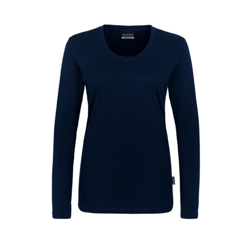 Klassisches Langarm-Shirt für Damen aus feinem, mittelschwerem Single Jersey aus ringgeponnener und gekämmter Baumwolle mit feminem Halsausschnitt und modisch schmalem Halsbündchen mit dekorativen Doppelnaht an Arm und Bund.
